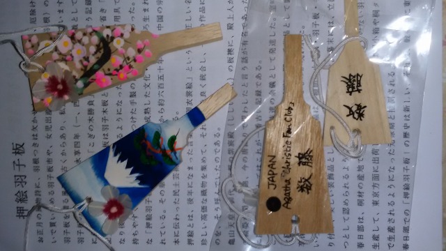 私の住んでいる春日部市は桐の板を使った羽子板製造が有名で、昔から続いている業者が多く、浅草の羽子板市の羽子板も殆ど作っている。その中でも"羽子板を世界に広めよう!"と考えて、市内の各小学校で児童に羽子板の絵付けをさせたり、"何回打てるか"などの競技の普及に努めている社長さんがいる。外国人が来ると名札を作って配ってくれる人なので、ひと声かけてみたところ、快く引き受けて下さった。出来上がったものは、参加者の名前入り名札が各2枚。富士山に松と桜の図柄に小さな羽とムクロが付いていた。お土産用は、小ぶりな桜の図柄が殆どだったが、他の図柄のも作ってくれて充分な数が用意された。