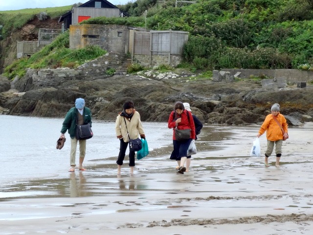 島と本土との距離は約 200m。見る見るうちに、映画「十戒」のように潮が引いていくではないか。午前中、島と本土を隔てていた海水はほとんどなくなった。対岸から島に向かって歩き出した人たちもいる。さあ、そろそろ渡るとするか。海岸まで降りると、数藤さんは履いている靴のまま、さっさと対岸にむかって歩き始めた。数人がそれに続く。ちょと、待って。せっかく持参したビーチサンダルはどうする。ここで使わなくては、いつ使うのだ! ということで、ビーサン(ビーチサンダル略称)に履き替える。先行の"靴"組は、濡れないようにと4WD車の轍(わだち)の跡を黙々と歩いていく。"ビーサン"組は、海水をたっぷりふくんだ砂を踏みしめながら、素足にイギリス海峡と大ブリテン島の大地をしっかりと感じて、対岸を目指す(註:"靴"組は、数藤、中田、井口、野村、川本の5名。"ビーサン"組は永嶋、蓮田、清水、戸塚、竹村、木村の6名であった)。
