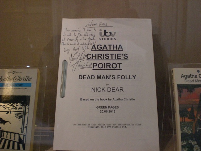 出版された本がおさめられている部屋(案内図ではFAX Room)には、Poirot のTVシリーズ"Dead Man's Folly "(2013年6月)のDavid Suchetサイン入り台本があった。最終話である"Curtain"を先に撮影し、ここGreenwayを舞台にした"Dead Man's Folly"を最後に撮影したという。彼のコメントは見たところ以下の通り(クセ字で読みにくいので間違っていたなら申し訳ありません)。