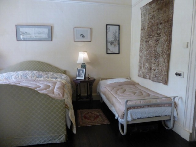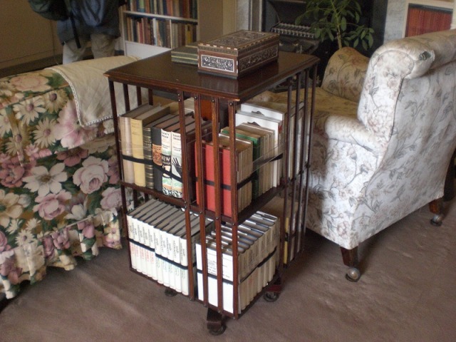 邸内には家族の油絵の肖像画や家族写真も並べられ、住む人の気配を感じさせられる。2階(英国では1階)の寝室には、中央にアガサの巨大なベッド、壁際には夫マローワンの小さなベッド。ウォークイン・クロゼットには年季の入った紺色のスーツケースや衣類があり、今にも旅支度をしたアガサがどこかから現れそうな雰囲気だ。また『カーテン』などにも登場する本棚付で回転するコーヒー・テーブルもあった。これには日本でお目にかかることがなく、最初に読んだときは想像できなかったが、実物を見るとなるほどと納得する。