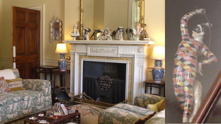 今回ぜひ見たいと思っていた、短編「戦勝舞踏会事件」に出て来たイタリアのコメディア・デラルテの登場人物アルレッキーノ(ハーリ・クィン)などの陶磁器の人形は、ピアノのある客間のガラス・ケースの中にあった。かつてアガサはこの人形を見てはいろいろな空想をしていたとか。アルレッキーノの人形は30センチに満たない大きさだが、ダイヤ柄の衣装がいまでも美しく、妖精らしくのびやかなポーズ。手に持っているのはなぜか鞭。