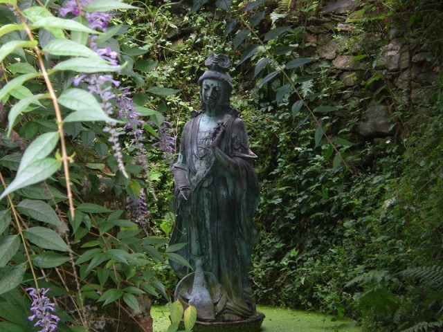 外に出て、ここに宿泊した唯一の日本人である数藤さんの案内のもと、森(というか山)を歩き、娘ロザリンドさんの2度目の夫の日本趣味を反映した、池のほとりにたたずむ仏像(奈良・秋篠寺の伎芸天に似るが足元に魚がいるので魚籃観音か)や黒竹の竹林を眺めつつ、ようやく川沿いのBoat Houseに到着。前回来たときよりも整備されている由。TVの撮影に使用したためであろうか。中には展示もされており、『そして誰もいなくなった』のお芝居のチラシが置いてあった。あとでチラシをよくみると主演のColin Buchananは1997年のTVドラマ「蒼ざめた馬」のマーク役を演じた俳優。当時は若くてハンサムだったので、顔写真を見ても気付かなかった。歳月人を待たず(他人事ではないが)。