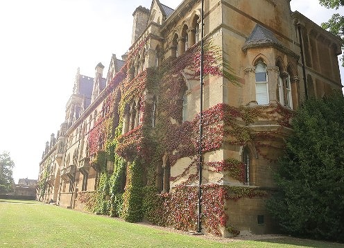 その後The Highを西へ進み有名なカーファックス・タワーの角を曲がって(こ の辺りは観光客で特に賑わっている)、St. Aldates (通り)を南下しクライスト・チャーチ(Christ Church)へ。ここも建物には入れなかったが南側の庭園に入り、イングリッシュ・ガーデンとツタの絡まる美しい建物メドウ・ビルディング(The Meadow Building)などの風景を楽しんだ。