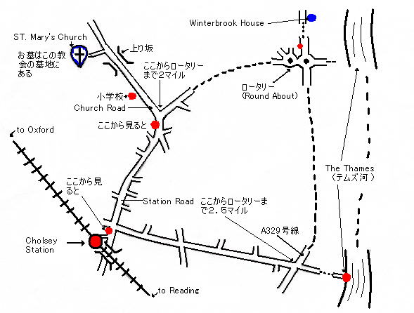- チャーチ・ロードの三叉路の直前にはコミュニティ・バスの停留所があるので、バスでもウォリングフォードへ行けると思われる。ウォリングフォードの中心部からウィンターブルックは、徒歩で10分ほどではないか。ただし実際にバスに乗ったわけではないので、あまり信用しないでください。